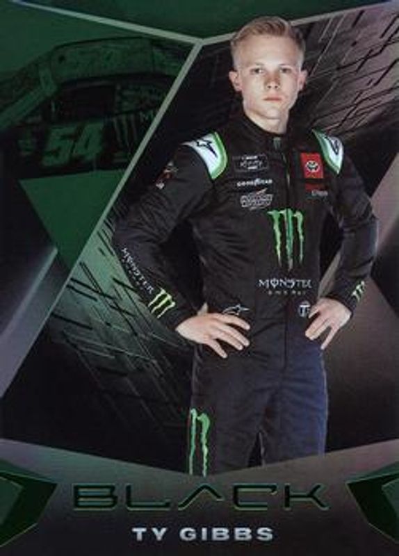 The Ty Gibbs 2022 Chronicles NASCAR #8 Black Green card is 1 of 110 Ty Gibbs' card variations in the 2022 Chronicles NASCAR set being tracked by Sports Card Investor, including Black, Black Autographs, Clear Vision, Magnitude, and Obsidian.