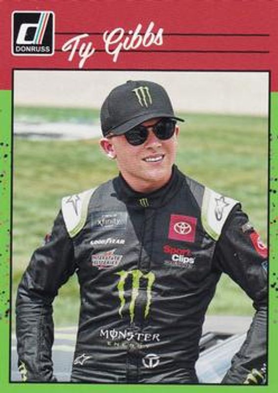 The Ty Gibbs 2023 Donruss NASCAR #156 Lime Green card is 1 of 68 Ty Gibbs' card variations in the 2023 Donruss NASCAR set being tracked by Sports Card Investor, including #71 Base, #156 Base, #156 Carolina Blue, #71 Carolina Blue, and #71 Lime Green.
