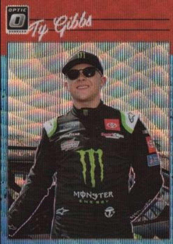 The Ty Gibbs 2023 Donruss NASCAR #90 Optic Carolina Blue Wave card is 1 of 68 Ty Gibbs' card variations in the 2023 Donruss NASCAR set being tracked by Sports Card Investor, including #71 Base, #156 Base, #156 Carolina Blue, #71 Carolina Blue, and #71 Lime Green.