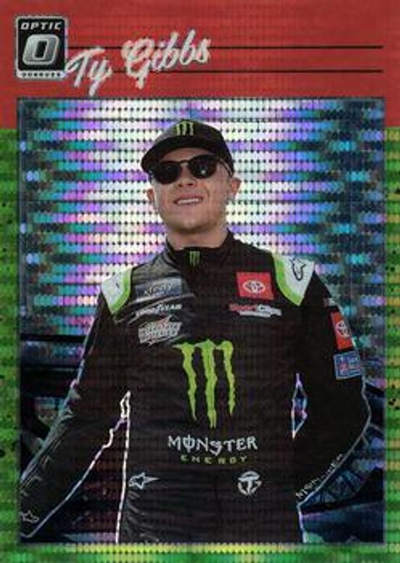 The Ty Gibbs 2023 Donruss NASCAR #90 Optic Lime Green Pulsar card is 1 of 68 Ty Gibbs' card variations in the 2023 Donruss NASCAR set being tracked by Sports Card Investor, including #71 Base, #156 Base, #156 Carolina Blue, #71 Carolina Blue, and #71 Lime Green.