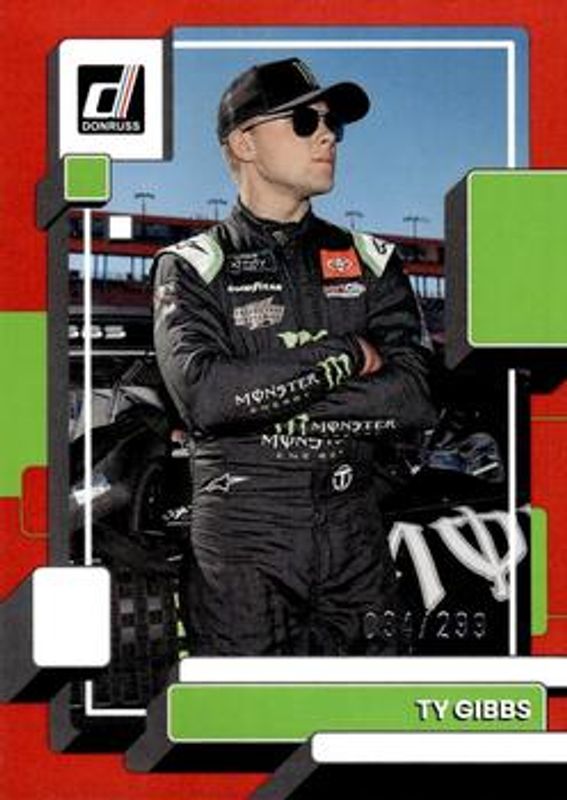 The Ty Gibbs 2023 Donruss NASCAR #71 Red /299 card is 1 of 68 Ty Gibbs' card variations in the 2023 Donruss NASCAR set being tracked by Sports Card Investor, including #71 Base, #156 Base, #156 Carolina Blue, #71 Carolina Blue, and #71 Lime Green.