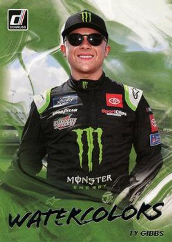 The Ty Gibbs 2023 Donruss NASCAR #W-TG Watercolors card is 1 of 68 Ty Gibbs' card variations in the 2023 Donruss NASCAR set being tracked by Sports Card Investor, including #71 Base, #156 Base, #156 Carolina Blue, #71 Carolina Blue, and #71 Lime Green.
