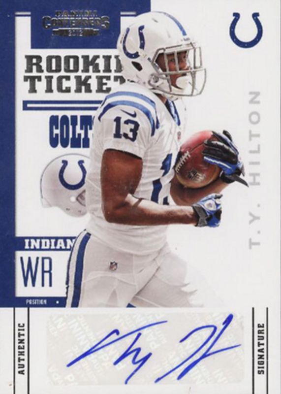 TY Hilton's Football cards are available in at least 165 sets. TY Hilton's biggest 7-day price movers are 2012 Contenders #186 Rookie Ticket Auto (One Hand on Ball), 2012 Topps Chrome #168 Gold Refractor /50, and 2016 Prizm #15 Draft Gems - Gold Mojo /10.