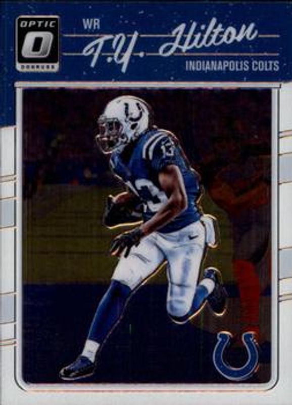 The TY Hilton 2016 Optic #46 Base card is 1 of 11 TY Hilton's card variations in the 2016 Optic set being tracked by Sports Card Investor, including Holo, Aqua /299, Orange /199, Blue /149, and Red /99.