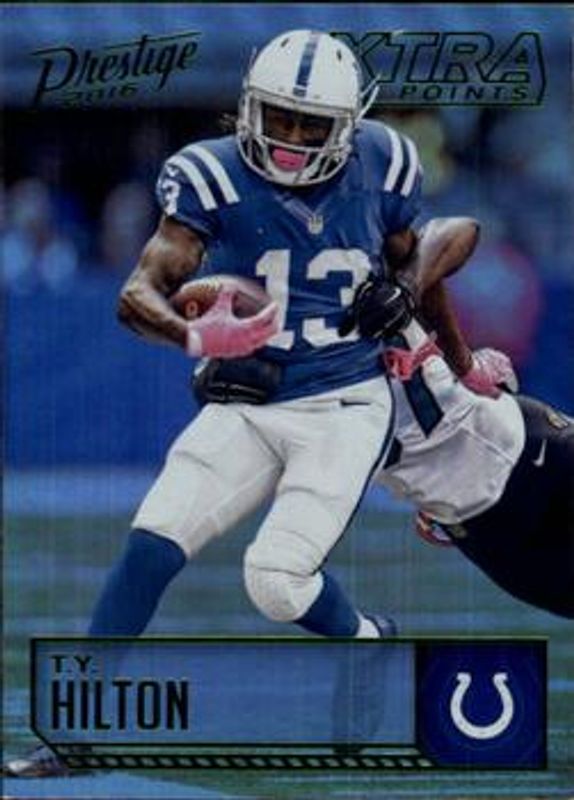 The TY Hilton 2016 Prestige #85 Xtra Points Green card is 1 of 8 TY Hilton's card variations in the 2016 Prestige set being tracked by Sports Card Investor, including Base, Xtra Points Blue, Xtra Points Red, Xtra Points Purple /100, and Xtra Points Gold /50.