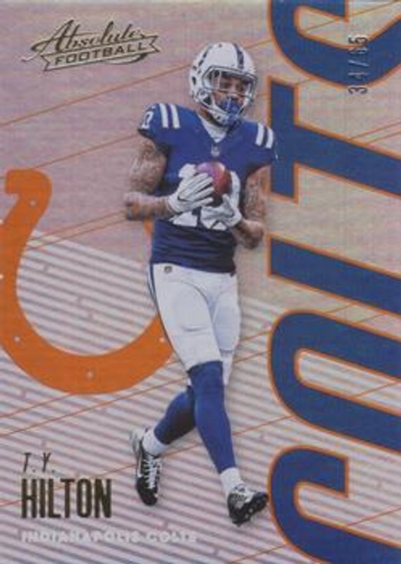 The TY Hilton 2018 Absolute #44 Orange Spectrum /65 card is 1 of 16 TY Hilton's card variations in the 2018 Absolute set being tracked by Sports Card Investor, including Base, Blue Spectrum, Gold Spectrum, Red Spectrum /100, and Green Spectrum /25.