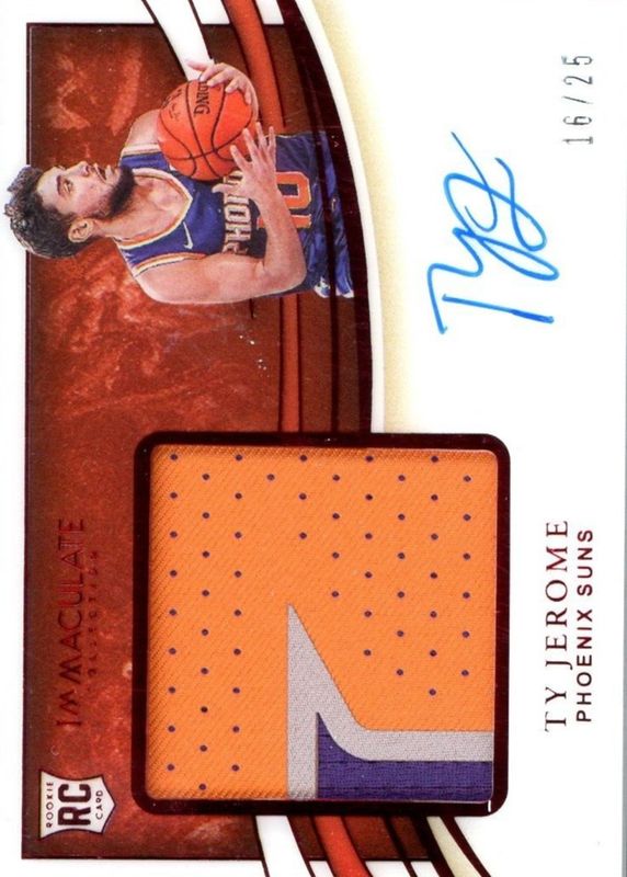 This card is 1 of 6 Ty Jerome's card variations in the 2019 Immaculate set being tracked by Sports Card Investor, including Rookie Patch Auto - Jersey Number (/10), Rookie Patch Auto /99, Rookie Patch Auto - Gold /10, Rookie Patch Auto - Tag /5, and Rookie Patch Auto - Logoman /1.