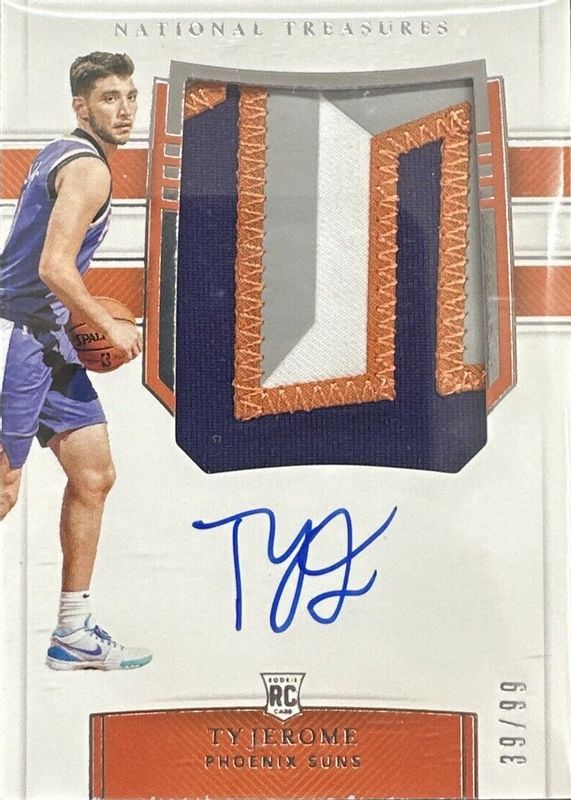 This card is 1 of 8 Ty Jerome's card variations in the 2019 National Treasures set being tracked by Sports Card Investor, including Rookie Patch Auto - Stars & Stripes /30, Rookie Patch Auto - Gold /10, Rookie Patch Auto - Emerald /5, Rookie Patch Auto - Stars & Stripes Blue /3, and Rookie Patch Auto - Logoman /1.
