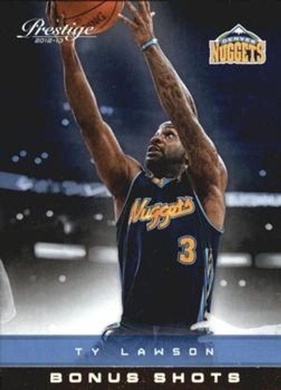 The Ty Lawson 2012 Prestige #88 Bonus Shots Gold /249 card is 1 of 12 Ty Lawson's card variations in the 2012 Prestige set being tracked by Sports Card Investor, including Base, Bonus Shots Black /10, Franchise Favorites, Inside the Numbers - Materials, and Prestigious Pros Signatures.