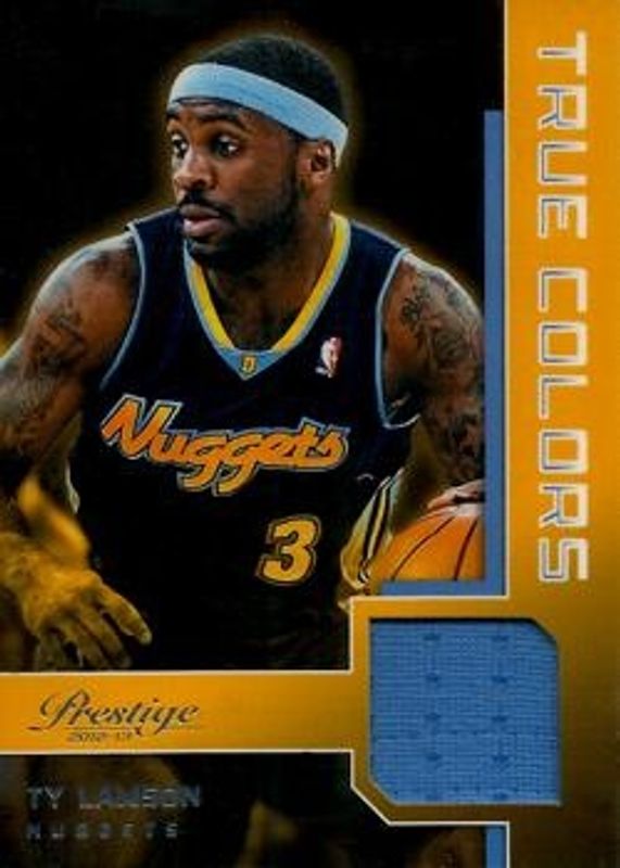 The Ty Lawson 2012 Prestige #11 True Colors - Materials card is 1 of 12 Ty Lawson's card variations in the 2012 Prestige set being tracked by Sports Card Investor, including Base, Bonus Shots Gold /249, Bonus Shots Black /10, Franchise Favorites, and Inside the Numbers - Materials.