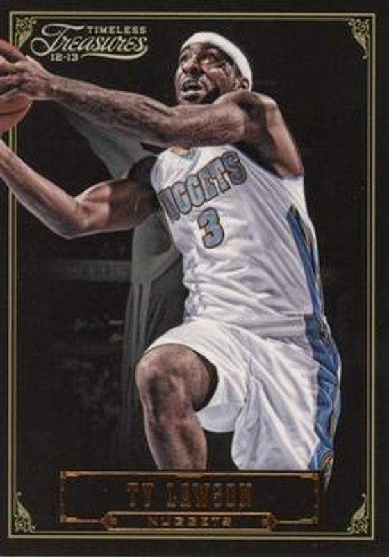 The Ty Lawson 2012 Timeless Treasures #150 Base /499 card is 1 of 5 Ty Lawson's card variations in the 2012 Timeless Treasures set being tracked by Sports Card Investor, including Silver /25, Gold /10, Platinum /1, and Validating Marks Autographs /98.