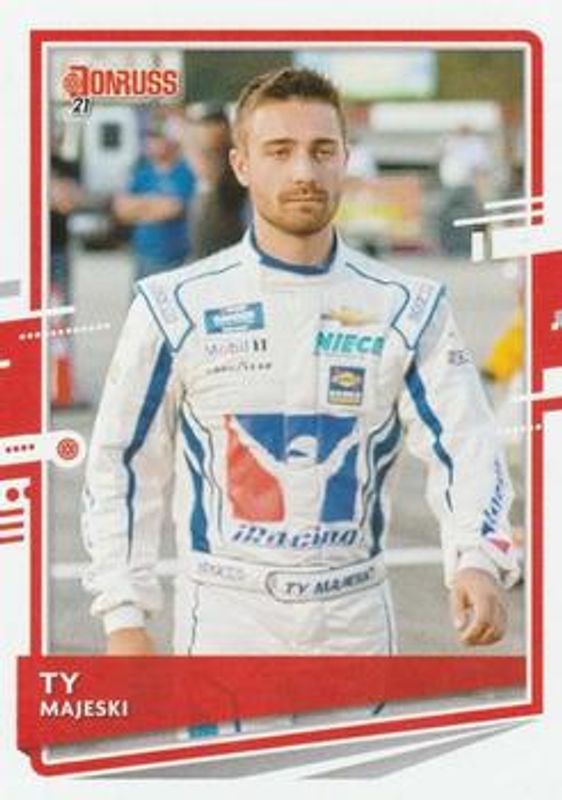 The Ty Majeski 2021 Donruss NASCAR #112 Base card is 1 of 44 Ty Majeski's card variations in the 2021 Donruss NASCAR set being tracked by Sports Card Investor, including #189 Base, #189 Carolina Blue, #112 Carolina Blue, #112 Orange, and #189 Orange.