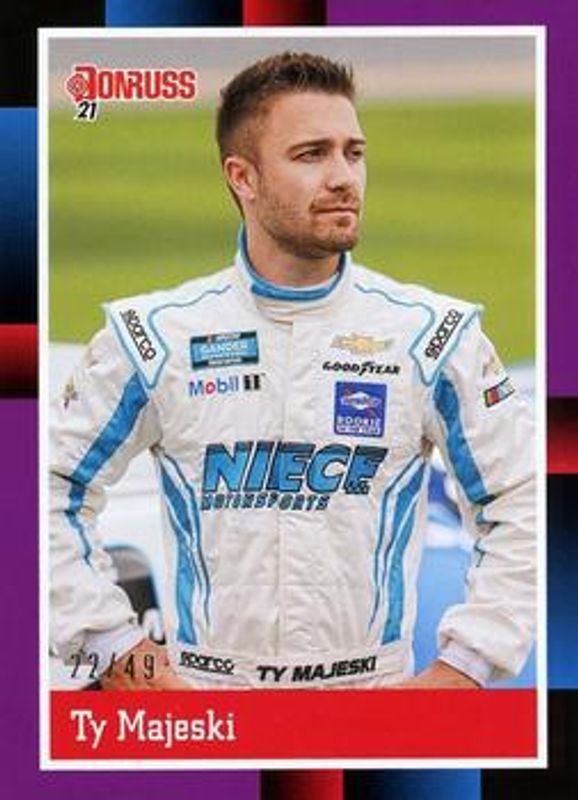 The Ty Majeski 2021 Donruss NASCAR #189 Purple /49 card is 1 of 44 Ty Majeski's card variations in the 2021 Donruss NASCAR set being tracked by Sports Card Investor, including #112 Base, #189 Base, #189 Carolina Blue, #112 Carolina Blue, and #112 Orange.