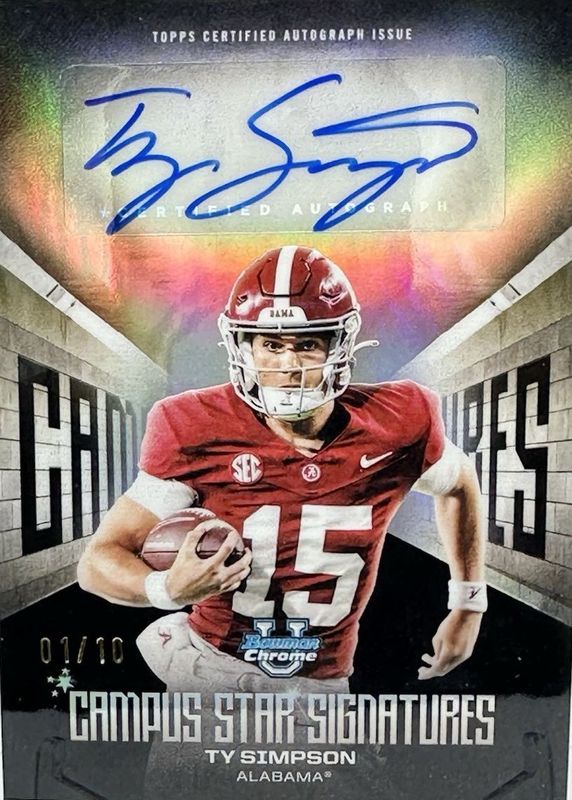 The Ty Simpson 2025 Bowman Chrome University #CSS-TS Campus Star Signatures - Black Refractor /10 card in Raw condition has not changed in price in the last 30 days and was last sold for $178.01 .