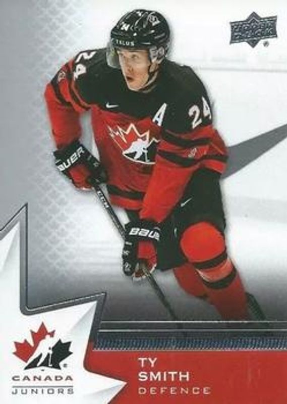 The Ty Smith 2020 Upper Deck Team Canada Juniors #40 Base Rookie card is 1 of 33 Ty Smith's card variations in the 2020 Upper Deck Team Canada Juniors set being tracked by Sports Card Investor, including #105 Base, #89 Base, #89 Exclusives /165, #40 Exclusives /165, and #105 Exclusives /165.