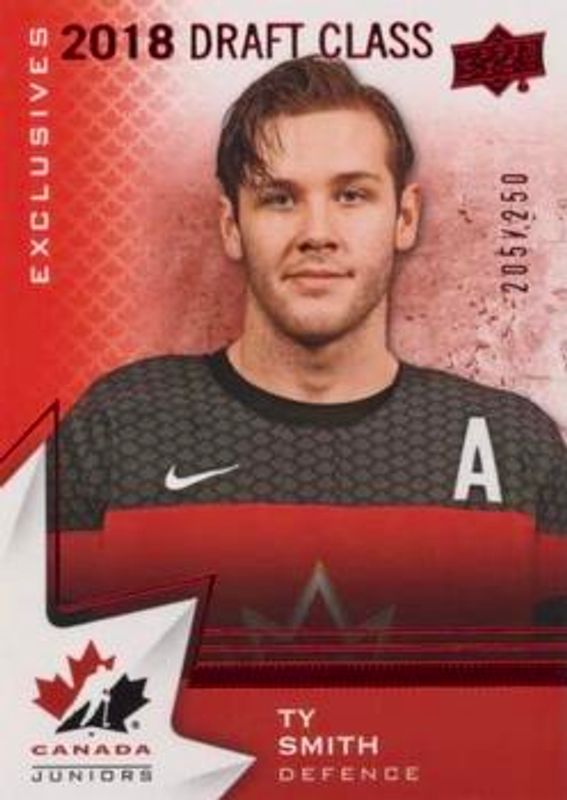 The Ty Smith 2020 Upper Deck Team Canada Juniors #89 Exclusives /165 Rookie card is 1 of 33 Ty Smith's card variations in the 2020 Upper Deck Team Canada Juniors set being tracked by Sports Card Investor, including #105 Base, #89 Base, #40 Base, #40 Exclusives /165, and #105 Exclusives /165.