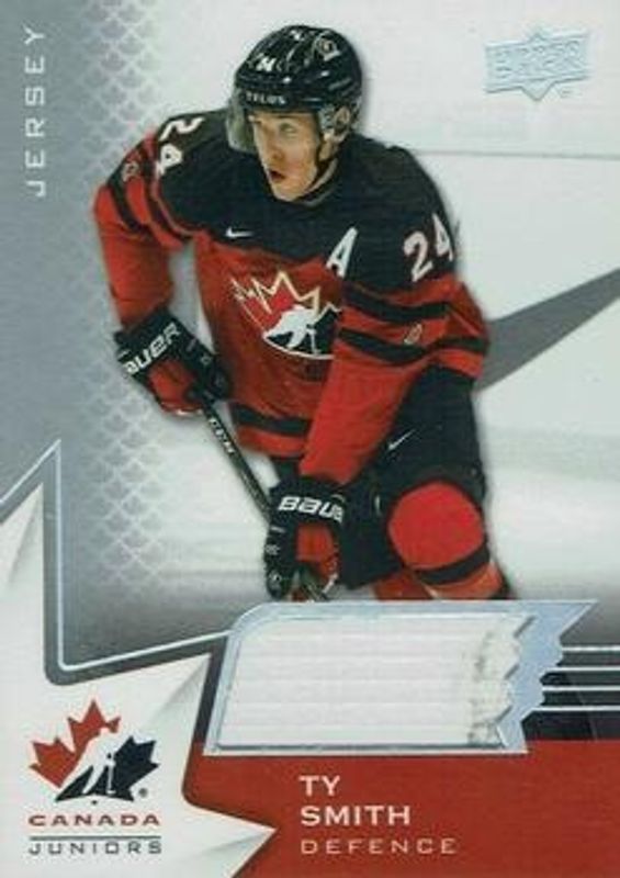 The Ty Smith 2020 Upper Deck Team Canada Juniors #40 Jerseys Rookie card is 1 of 33 Ty Smith's card variations in the 2020 Upper Deck Team Canada Juniors set being tracked by Sports Card Investor, including #105 Base, #89 Base, #40 Base, #89 Exclusives /165, and #40 Exclusives /165.