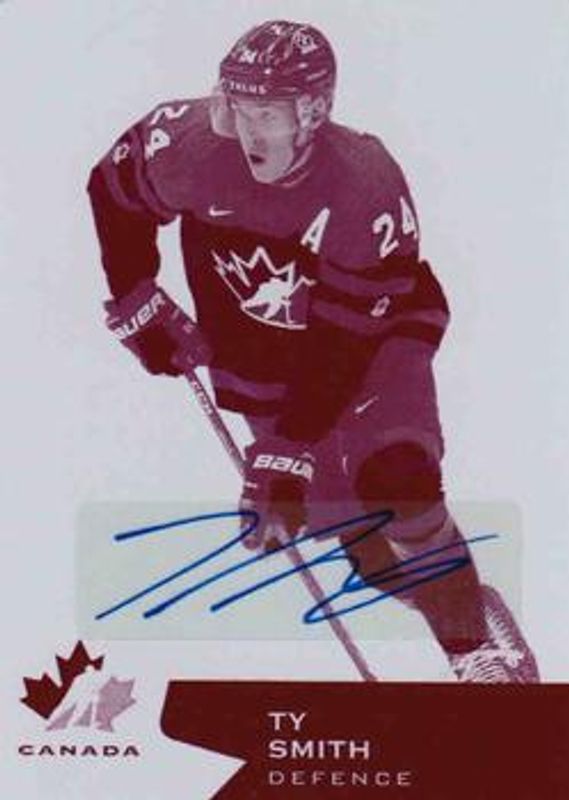 The Ty Smith 2020 Upper Deck Team Canada Juniors #40 Printing Plates - Magenta /1 Rookie card is 1 of 33 Ty Smith's card variations in the 2020 Upper Deck Team Canada Juniors set being tracked by Sports Card Investor, including #105 Base, #89 Base, #40 Base, #89 Exclusives /165, and #40 Exclusives /165.