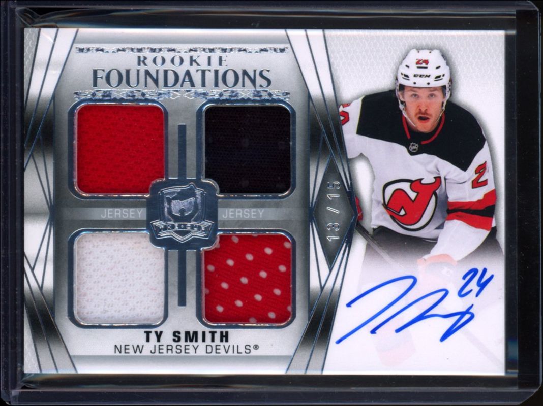 The Ty Smith 2020 Upper Deck The Cup #F-SM Foundations Quad Jersey Auto /15 Rookie card is 1 of 49 Ty Smith's card variations in the 2020 Upper Deck The Cup set being tracked by Sports Card Investor, including Base /99, Artist Proof Rookie Class of 2021 Gold Foil Auto Patch, Gold Spectrum Foil /36, Gold Foil /24, and Green Foil /3.