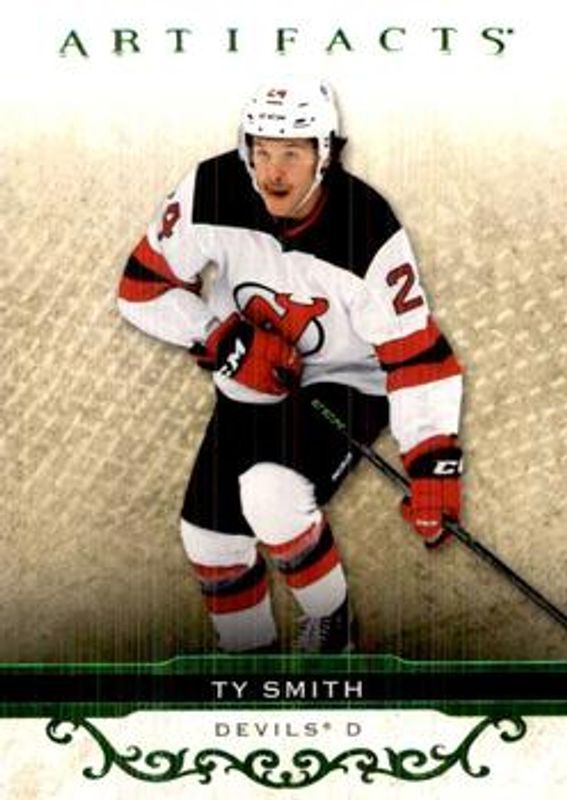 The Ty Smith 2021 Upper Deck Artifacts #61 Neon Green card is 1 of 28 Ty Smith's card variations in the 2021 Upper Deck Artifacts set being tracked by Sports Card Investor, including Base /999, Rose Gold, Turquoise, Ruby /499, and Silver Spectrum /299.