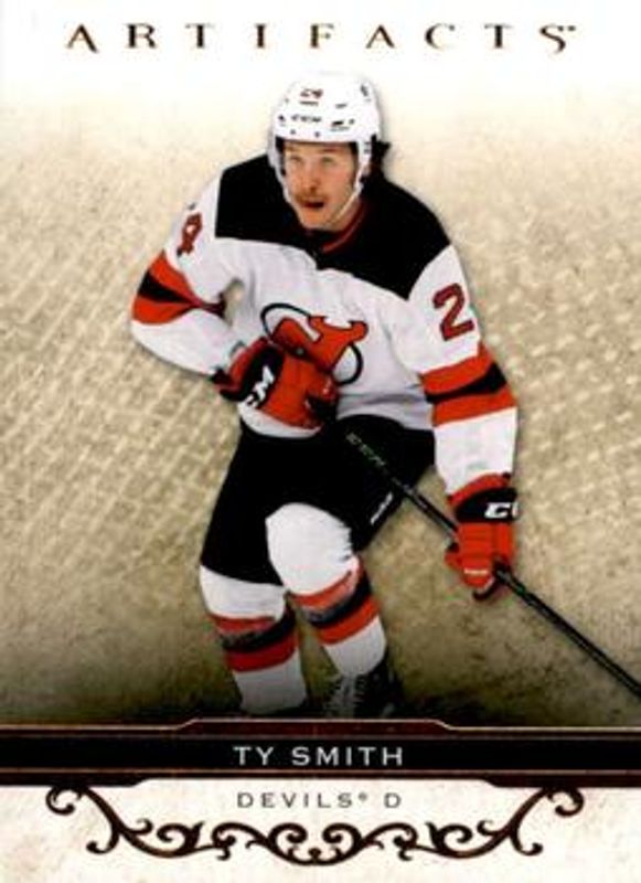 The Ty Smith 2021 Upper Deck Artifacts #61 Rose Gold card is 1 of 28 Ty Smith's card variations in the 2021 Upper Deck Artifacts set being tracked by Sports Card Investor, including Base /999, Neon Green, Turquoise, Ruby /499, and Silver Spectrum /299.