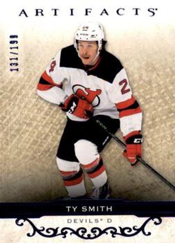 The Ty Smith 2021 Upper Deck Artifacts #61 Royal Blue /199 card is 1 of 28 Ty Smith's card variations in the 2021 Upper Deck Artifacts set being tracked by Sports Card Investor, including Base /999, Neon Green, Rose Gold, Turquoise, and Ruby /499.