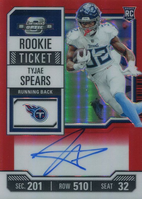Best Prices Available For Sale of Tyjae Spears 2023 Contenders Optic #138 Rookie Ticket Auto - Red (/125)