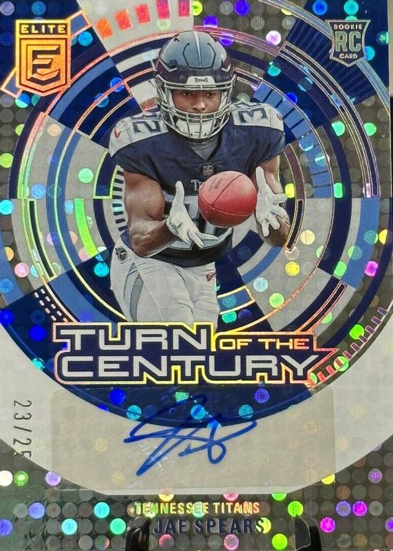The Tyjae Spears 2023 Elite #TC-TSP Turn of the Century Autographs - Blue /25 Rookie card in Raw condition has not changed in price in the last 30 days and was last sold for $25.00 .