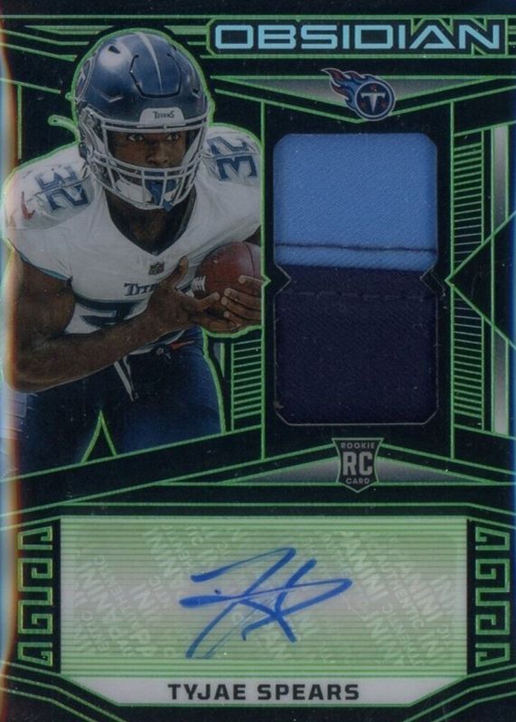 The Tyjae Spears 2023 Obsidian #201 Rookie Jersey Autographs - Electric Etch Green /25 card in Raw condition has not changed in price in the last 30 days and was last sold for $45.00 .
