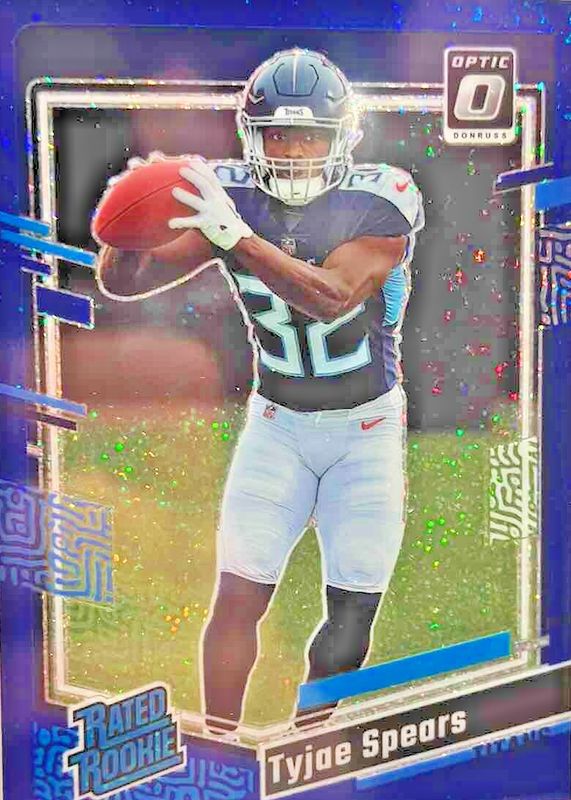The Tyjae Spears 2023 Optic #297 Blue Glitter /(SSP) Rookie card in Raw condition has not changed in price in the last 30 days and was last sold for $1.25 .