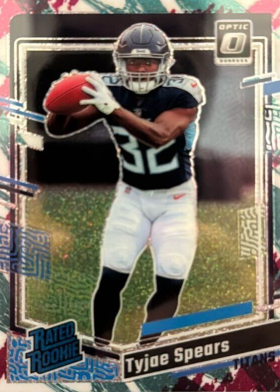 This card is 1 of 53 Tyjae Spears' card variations in the 2023 Optic set being tracked by Sports Card Investor, including Base, Blue Hyper, Blue Scope, Green Hyper, and Green Velocity.