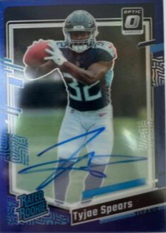 The Tyjae Spears 2023 Optic #297 Rated Rookie Autographs - Blue /99 card in Raw condition has moved up $1.00 (+18.2%) in the last 30 days and was last sold for $6.50 .