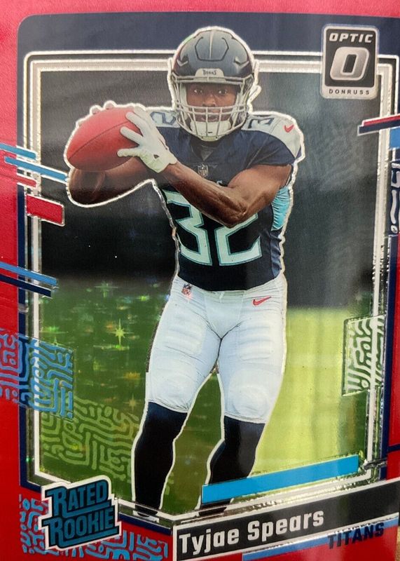 The Tyjae Spears 2023 Optic #297 Red Stars /(SSP) Rookie card in Raw condition has not changed in price in the last 30 days and was last sold for $3.14 .