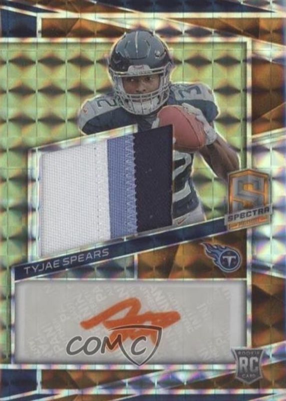 This card is 1 of 19 Tyjae Spears' card variations in the 2023 Spectra set being tracked by Sports Card Investor, including Rookie Patch Auto /99, Rookie Patch Auto - Celestial /75, Rookie Patch Auto - Supernova /70, Rookie Patch Auto - Hyper /60, and Rookie Patch Auto - Neon Blue /50.