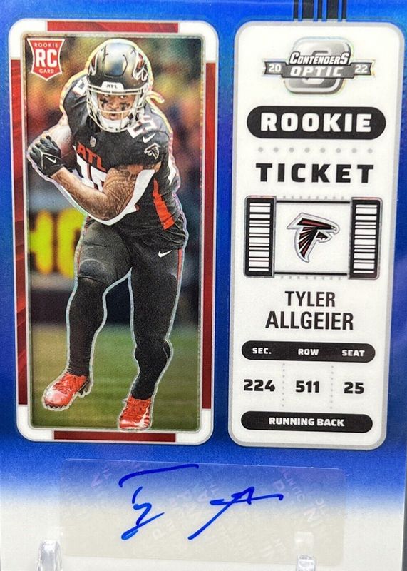The Tyler Allgeier 2022 Contenders Optic #203 Rookie Ticket Auto - Blue /75 card in Raw condition has not changed in price in the last 30 days and was last sold for $1.25 .