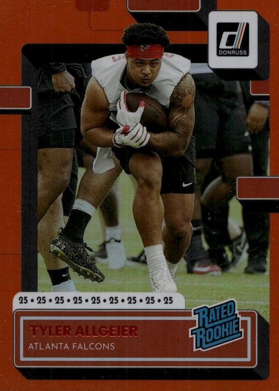 The Tyler Allgeier 2022 Donruss #344 Jersey Number (/25) Rookie card in Raw condition has not changed in price in the last 30 days and was last sold for $10.60 .
