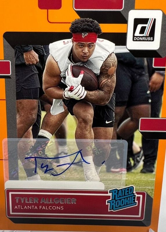 The Tyler Allgeier 2022 Donruss #344 Rated Rookie Autographs - Orange card in Raw condition has not changed in price in the last 30 days and was last sold for $35.00 .