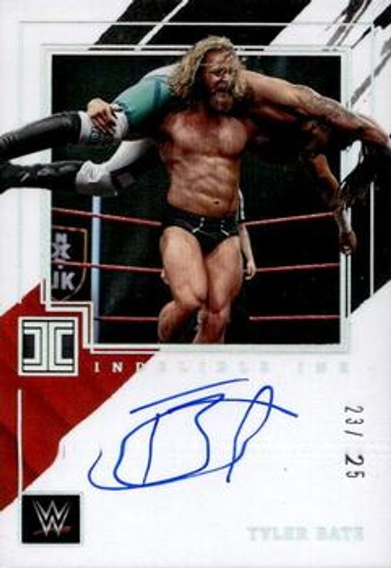 The Tyler Bate 2022 Impeccable WWE #IN-TBT Indelible Ink - Holo Silver /25 card is 1 of 4 Tyler Bate's card variations in the 2022 Impeccable WWE set being tracked by Sports Card Investor, including Indelible Ink /99, Indelible Ink - Holo Gold /10, and Indelible Ink - Platinum /1.