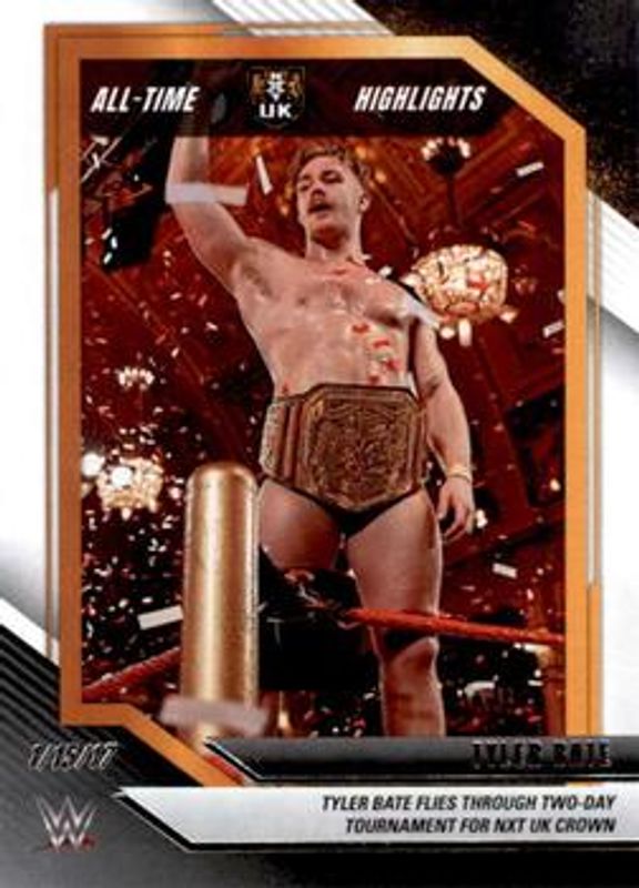The Tyler Bate 2022 Panini WWE NXT #9 All Time NXT Highlights card is 1 of 51 Tyler Bate's card variations in the 2022 Panini WWE NXT set being tracked by Sports Card Investor, including Base, Green, Silver, Red /199, and Blue /149.