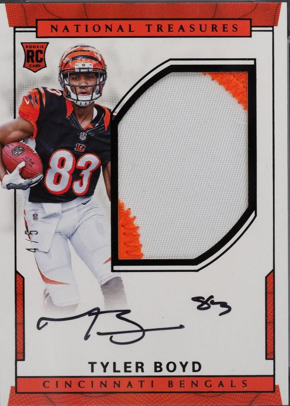 This card is 1 of 11 Tyler Boyd's card variations in the 2016 National Treasures set being tracked by Sports Card Investor, including Rookie Patch Auto /99, Rookie Patch Auto - Numbers Green (/83), Rookie Patch Auto - Holo Silver /25, Rookie Patch Auto - 10th Anniversary /10, and Rookie Patch Auto - 10th Anniversary Platinum /10.