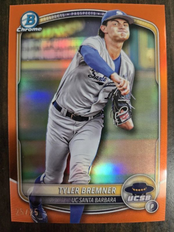 The Tyler Bremner 2025 Bowman Draft #BDC-37 Chrome College Variation - Orange Refractor /25 card in Raw condition has not changed in price in the last 30 days and was last sold for $92.97 .