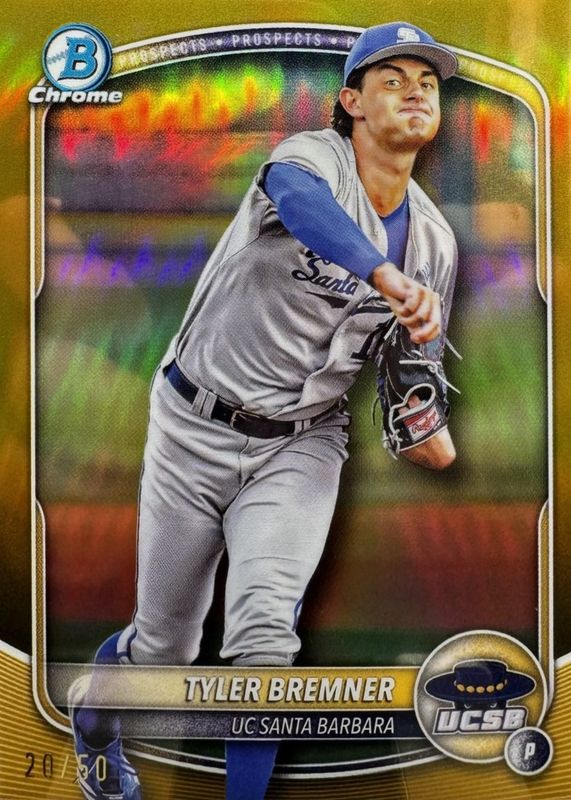 The Tyler Bremner 2025 Bowman Draft #BDC-37 Chrome - Gold Refractor /50 (1st) card in Raw condition has not changed in price in the last 30 days and was last sold for $92.00 .