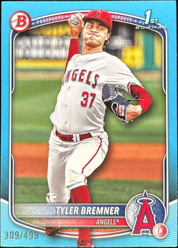 The Tyler Bremner 2025 Bowman Draft #BD-37 Sky Blue Border /499 card is 1 of 135 Tyler Bremner's card variations in the 2025 Bowman Draft set being tracked by Sports Card Investor, including Base (1st), Base, Chrome (1st), Chrome College Variation, and Chrome Image Variation.
