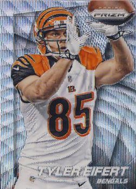 The Tyler Eifert 2014 Prizm #140 Light Blue Wave /99 card is 1 of 19 Tyler Eifert's card variations in the 2014 Prizm set being tracked by Sports Card Investor, including Base, Blue, Camo, Green, and Neon Green & Yellow.