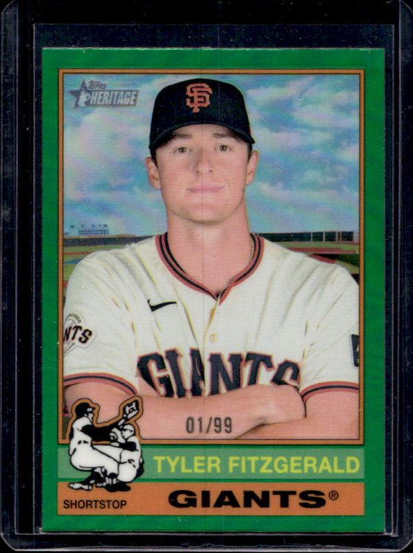 The Tyler Fitzgerald 2025 Topps Heritage #238 Chrome - Green Refractor /99 card is 1 of 28 Tyler Fitzgerald's card variations in the 2025 Topps Heritage set being tracked by Sports Card Investor, including Base, Black Border, Dark Blue Border, Dark Green Border, and Dark Yellow Border.