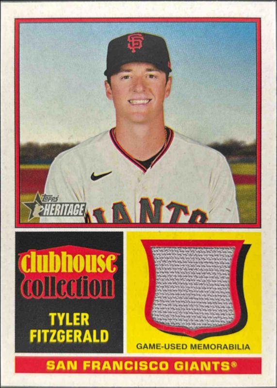 The Tyler Fitzgerald 2025 Topps Heritage #CCR-TF Clubhouse Collection Relics card is 1 of 28 Tyler Fitzgerald's card variations in the 2025 Topps Heritage set being tracked by Sports Card Investor, including Base, Black Border, Dark Blue Border, Dark Green Border, and Dark Yellow Border.