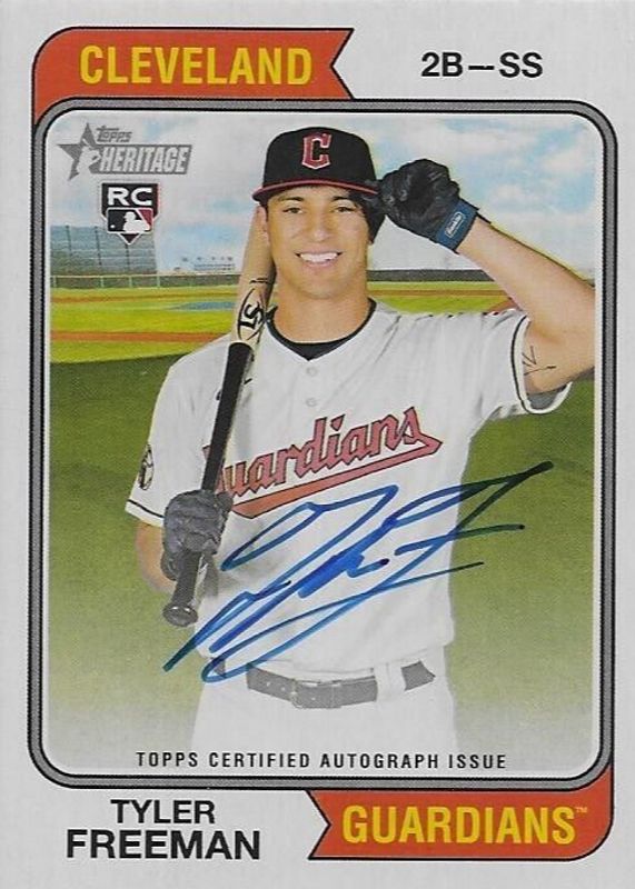 This card is 1 of 2 Tyler Freeman's card variations in the 2023 Topps Heritage set being tracked by Sports Card Investor, including Real One Autographs - Red Ink /74.