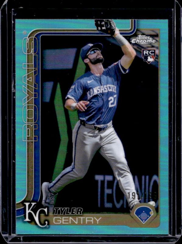 The Tyler Gentry 2025 Topps Chrome #218 Aqua Refractor /199 Rookie card is 1 of 72 Tyler Gentry's card variations in the 2025 Topps Chrome set being tracked by Sports Card Investor, including Base, Geometric Refractor, Lightboard Logo Variation, Negative Refractor, and Prism Refractor.