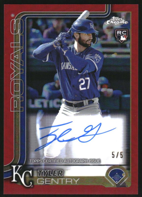 The Tyler Gentry 2025 Topps Chrome #RA-TGE Rookie Autographs - Red Refractor /5 card is 1 of 72 Tyler Gentry's card variations in the 2025 Topps Chrome set being tracked by Sports Card Investor, including Base, Geometric Refractor, Lightboard Logo Variation, Negative Refractor, and Prism Refractor.