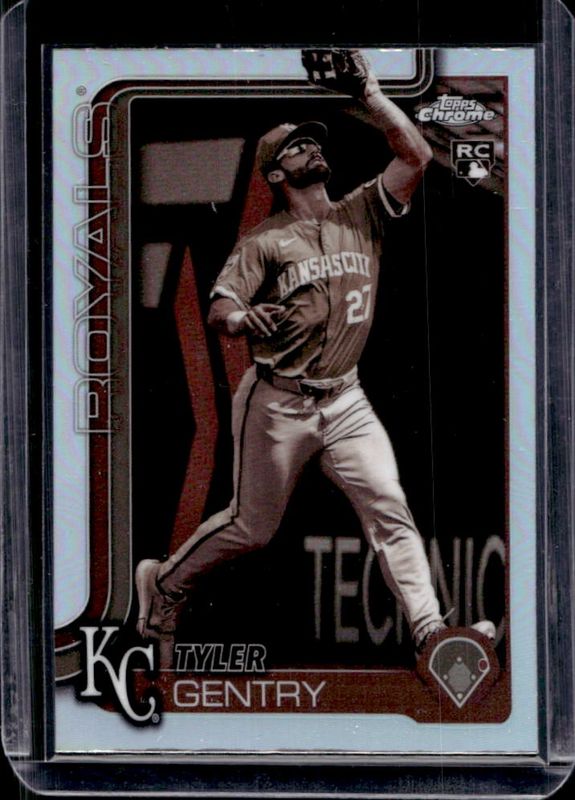 The Tyler Gentry 2025 Topps Chrome #218 Sepia Refractor Rookie card is 1 of 72 Tyler Gentry's card variations in the 2025 Topps Chrome set being tracked by Sports Card Investor, including Base, Geometric Refractor, Lightboard Logo Variation, Negative Refractor, and Prism Refractor.
